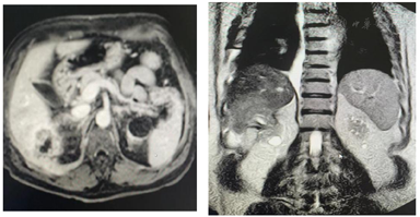 辅助检查:⑴肾脏彩超(2020年6月5日):双肾慢性损害性改变,左肾结石。双肾血流稍稀疏,血流参数正常;⑵肝胆胰脾彩超(2021年3月15日):脂肪肝(轻度)。胆囊壁毛糙。胰脾正常;⑶心脏彩超:左心增大。左室舒张功能减退。心包腔少量积液。彩超(腹部:含肝胆脾胰):肝内占位,性质待定,建议进一步检查;脂肪肝(轻度);胆囊壁胆固醇结晶;胆囊壁毛糙;胰脾未见明显异常;⑷胸部CT:右侧胸腔少量积液;心脏增大,心包少量积液;建议彩超检查;双肺间质性病变;⑸上腹部CT:肝右叶似见片状低密度影,建议行MRI检查,见图1。肝实质密度普遍减低,提示脂肪肝改变。胆囊管结石。上腹部MRI增强:右肾占位,考虑肾癌,并侵犯肝右叶及腹膜可能,见图2。双肾多发囊肿。肝S3段异常信号,考虑囊肿可能。右侧胸腔及心包积液;⑹心电图:窦性心律。完全性右束支传导阻滞。