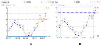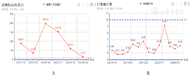 术后随访炎症指标下降,见图3A、B,贫血逐步改善至达标,见图4A、B,促红细胞生成素剂量逐步改为每周10 000 U皮下注射,精神状况好转,生活质量提高。