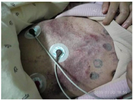 入院查体:T 35.7℃,BP 139/98 mmHg(1 mmHg=0.133 kPa),P 76次/min,R24次/min,体重29 kg,BMI 11.3 kg/m2,极度消瘦脱水貌,结膜苍白,全身布满瘀点瘀斑(图1),心界向左下偏大,两下肺可闻及湿啰音,下肢无浮肿,尾骶部Ⅱ度压疮,双下肢肌力Ⅰ级,双上肢肌力2级,双侧巴氏征阴性。入院辅助检查:①生化:尿素氮101 mmol/L,肌酐2830 umol/L,血钾1.2 mmol/L,血钠126mmol/L,血氯68 mmol/L,血钙1.58 mmol/L,血磷6.2 mmol/L,尿酸1228 umol/L,白蛋白31.5g/L;②血常规:血红蛋白29 g/L;③粪常规:大便隐血+++;④D-二聚体>20 ug/ml;⑤PTH 522 pg/ml;⑥血气分析提示中度代酸;⑦肿瘤指标:ca199 948 U/mL,ca125 1736.8 U/mL;⑧B超提示双肾萎缩,腹腔大量积液,头颅CT示轻度脑萎缩。