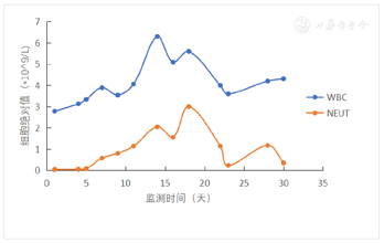 外周血涂片:白细胞总数减少,未见原始及幼稚细胞,中性粒细胞缺如,其余未见明显异常。患者白细胞及中性粒细胞计数变化情况见图1。