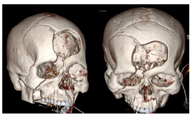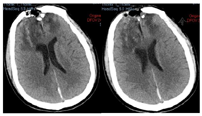 体格检查:患者意识深昏迷,气管切开状态,留置胃管、尿管,二便无异常。GCS评分E1VTM3,头颅额面部正中有一Y字型伤口,已缝合,有淡黄色液体渗出,双侧眼睑青紫,双侧瞳孔不等大,左侧直径1.5mm,对光反射迟钝,右侧直径3.0mm,对光反射消失。双肺呼吸音稍粗,未闻及明显湿性啰音;心率齐,心脏各瓣膜区未闻及杂音;腹平坦、软,肝脾未扪及肿大,腹壁反射正常,肠鸣音可闻及,约4次/min。四肢肢体强直,肌张力稍高,双侧肱二、三头肌腱反射正常,双侧膝、跟腱反射正常,双侧Babinski征弱阳性,双侧Kernig征阴性。