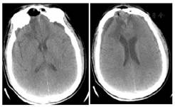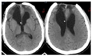 对于慢性创伤性脑积水的患者,脑积水原因多为脑脊液吸收障碍所致,多见于伤后3-6周。表现为脑积水症状,逐渐出现痴呆、步态不稳、反应迟钝及行为异常。合并有严重颅内感染病程的患者尤其多见慢性脑积水。创伤性脑积水的诊断主要依靠明确的脑外伤病史,伤后持续昏迷或苏醒后意识又无端恶化,并可出现精神症状。颅脑CT检查提示脑室系统扩大伴脑室尤其是额角周围有明显的间质水肿带即可明确诊断。一旦脑积水诊断明确,应尽早根据不同压力水平脑积水的病理生理特点选择个性化的手术方案[8]。
