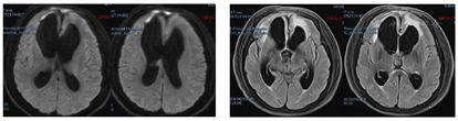 2021年10月18日,行"脑室腹壁外引流术",术后精神状态较前好转。2021年11月2日,患者GCS评分13分,简易智力状态检查量表(Mini-mental State Examination,MMSE)评分7分,转至康复科进行康复治疗,给予运动疗法、关节松动训练、平衡功能训练、电动起立床、等速肌力训练、低频、生物反馈、电针等综合康复治疗。2021年11月17日,患者住院期间间断出现高热,脑脊液培养提示:人葡萄球菌;脑脊液宏基因检测,提示真菌感染。给予脑室腹壁外持续引流,并给予伏立康唑200mg、每12小时1次抗真菌治疗,万古霉素1.0g、每12小时1次抗人葡萄球菌感染。2021年12月1日,患者体温趋于稳定,停用万古霉素、伏立康唑,给予氟康唑片(150mg)口服、每12小时1次抗真菌治疗。2021年12月14日,再次出现间断发热,转至感染科治疗。血培养结果未见明显异常,化验脑脊液提示:WBC:45×106/L,蛋白质0.62 mmol/L,继续给予氟康唑片(150mg)口服、每12小时1次抗真菌治疗,加用万古霉素1.0g、每12小时1次抗感染治疗。复查头颅MRI提示脑积水较前稍减轻,患者GCS评分13分,MMSE评分9分。2022年1月10日,患者体温稳定,未再发热,化验脑脊液提示:WBC:35×106/L,蛋白质0.48 mmol/L,停用万古霉素、氟康唑片,并转入神经外科。2022年1月17日,行"脑室腹壁外分流管拔除+VP分流术"控制脑积水。术后半月出院,此时患者的认知功能较前改善,MMSE评分15分,出院后于外院继续康复治疗。