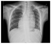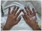 患者入院查体:体温36.4℃,脉搏98次/分,呼吸21次/分,血压147/91 mmHg;SPO2 60%;发育正常,营养中等,无病容,表情自如,神志清楚,自主体位,查体合作。口唇明显青紫,面部青紫,双肺呼吸音清,未闻及明显干湿啰音,心音可,律齐,P2<A2,胸骨左缘2、3、4肋间闻及2-3/6级粗糙的收缩期杂音。腹部平坦,腹壁软,全腹无压痛,无反跳痛、肌紧张反跳痛、肌紧张,肝肋下未触及,胆囊未触及,脾不大,无移动性浊音,双侧肾区无叩痛,肠鸣音正常。双下肢无水肿。四肢末梢青紫,伴杵状指(图1)。