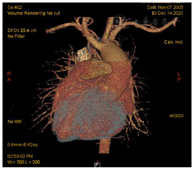 入院后,完善各项术前检查,包括心脏超声(图2),心脏及大血管CT(图3),调整患者营养状况,进行呼吸功能训练并多次进行多学科团队讨论。最后明确术前诊断:先天性心脏病:矫正型大动脉转位,室间隔缺损,肺动脉及其瓣下狭窄,二尖瓣中量返流,体肺侧支循环,间断加速性室性自主心律,室性早搏,房性早搏。