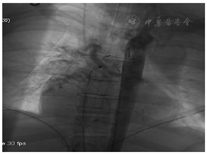 造影测压:肺动脉压47/15/26 mmHg,右室103/12 mmHg,三尖瓣上40/5 mmHg,右心房测34/27 mmHg(图5)。