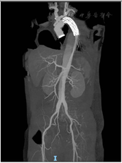 患者首次术后4 d出现迟发性截瘫,遂行"腰大池引流术",术后给予抗感染治疗、对症处理、稳定内环境等治疗后,患者肌力恢复至2级好转出院,期间定期随访,按时复查;复查8月后发现继发胸腹主动脉瘤,行二次术后恢复期间病情稳定,纳食可,大小便正常,病程期间体重未有减轻。期间积极进行康复治疗,肌力恢复至4级,器械辅助下可下地活动,术后16 d完善术后相关检查,好转出院。6个月后随访CTA示:支架无移位,无内漏;人工血管通畅。