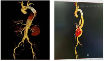 患者继发胸腹主动脉瘤后二次入院,入院时遵医嘱给予持续心电监护及氧气吸入,术前予以止痛、降压、控制心率等对症处理,完善术前检查,择期行"胸腹主动脉瘤切除人工血管置换+肋间动脉重建+腹主动脉-双股动脉Y型人工血管转流术"。术后常规进行抗感染、对症处理、稳定内环境等治疗,并给予综合护理干预:包括循环系统、神经系统、呼吸系统、泌尿系统、消化系统护理及皮肤、康复、心理护理等综合护理。经积极治疗后,患者下肢肌力恢复至4级,康复出院(患者行该手术前、后的CTA结果对比详见图2)。