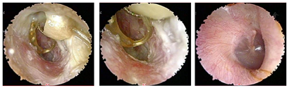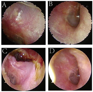 耳内镜:左外耳道内可见脓性分泌物,内镜下清理后见人工耳蜗电极导线自外耳道后壁突入外耳道内,呈不规则盘曲。左侧鼓膜表面少量分泌物,鼓膜紧张部及松弛部未见穿孔。右侧鼓膜完整,标志清楚(图1)。