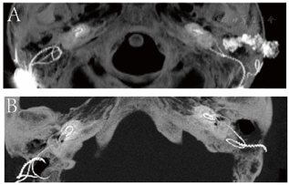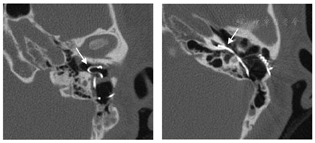 耳内镜下左外耳道内可见脓性分泌物,清理后见人工耳蜗电极导线自外耳道后壁突入外耳道内,鼓膜未见穿孔。右侧鼓膜完整,标志清楚。纯音测听检查:双侧极重度感音神经性聋。颞骨高分辨率CT检查示左外耳道内可见高密度电极导线影,耳蜗内电极已大部分脱出于蜗外,仅电极尖端部分留存于耳蜗底周。左侧中耳乳突炎。右侧外耳道及鼓室腔干净。