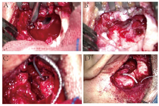 此类患者一经诊断,均需尽快通过手术彻底清除胆脂瘤并重建外耳道壁,避免感染经由电极导线向内耳蔓延。总的原则是在控制感染、清除病变、力求干耳的基础上,保护耳蜗电极,避免不必要的再植入[5]。术前根据患者脓性分泌物的药敏结果选择合适的抗生素;术中应小心操作,避免误伤电极导线或牵拉蜗内电极。若术中发现电极导线受脓性分泌物污染,已出现内耳或颅内感染征象时,应移除蜗外电极并行对侧人工耳蜗植入手术。若电极导线未被污染,则可行保留人工耳蜗的感染性病灶清除术。治疗术式可采用改良乳突根治术,联合径路鼓室成形术等。外耳道后壁重建可采用耳软骨及颞肌筋膜等。经及时、彻底的病变清理,大部分患者可保留原有耳蜗电极,避免重新植入[3]。病变清理结束、外耳道后壁重建完成后,应行神经遥测了解蜗内电极是否仍正常工作,必要时行C臂检查,明确蜗内电极有无位置异常,尽早发现并处理胆脂瘤清除术对原植入电极的不良影响。