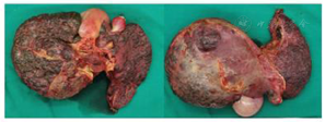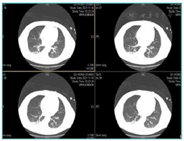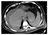 2021年10月28日于青岛大学附属医院行腹部CT(图1)提示肝硬化、脾大、门脉高压、腹水表现、胆囊区高密度影。2021年10月28日胸部CT(图2)提示左肺上叶炎性结节可能,双肺坠积性炎症可能性大,双侧胸膜增厚,右侧少量胸腔积液、心腔密度减低。