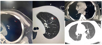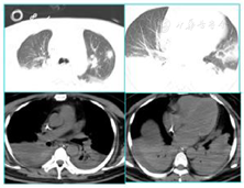 患者经口气管插管后给予床旁纤维支气管镜及肺泡灌洗等检查,并留取相关培养。肺泡灌洗液及痰培养结果为肺炎克雷伯菌肺炎亚种、嗜麦芽窄食单胞菌、少动鞘氨醇单胞菌、铜绿假单胞菌、耐甲氧西林金黄色葡萄球菌(Methicillin-resistant Staphylococcus aureus,MRSA)。肺泡灌洗液二代测序技术(又称高通量测序技术,Next Generation Sequencing Technology,NGS)检查:肺炎克雷伯菌、嗜麦芽窄食单胞菌、屎肠球菌、表皮葡萄球菌、EB病毒、巨细胞病毒。血培养为表皮葡萄球菌和摩根菌摩根亚种。尿培养示摩根菌摩根亚种。真菌GM试验2.98S/CO(正常<0.5),真菌G试验1050.2 pg/ml(>151.5阳性)。巨细胞病毒DNA 2.02E+03拷贝/ml(阳性,正常≤5.00E+02)。2021年11月5日行胸部CT检查提示双侧胸腔积液伴双肺下叶萎缩不张,左肺上叶结节,双肺坠积性炎症改变(图7)。