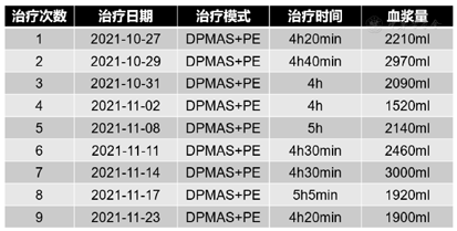 入院后立即给予经口气管插管接呼吸机辅助呼吸,判断意识为深昏迷(Glasgow评分:2+T),给予保肝、降血氨、退黄、营养支持等治疗,并给予双重血浆分子吸附系统(Double plasma molecules adsorption system,DPMAS)联合血浆置换(Plasma exchange,PE)并序贯连续肾脏替代疗法(Continuous renal replacement therapy,CRRT)支持治疗。治疗时间及模式见图3。经治疗后患者血氨变化情况见图4,总胆红素变化情况见图5,转氨酶变化情况见图6。