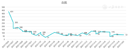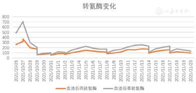 2021年10月26日入院时查血常规:白细胞计数12.11×109/L,红细胞计数3.20×1012/L,血红蛋白106 g/L,红细胞压积31.30%,血小板58×109/L;全血C反应蛋白23.96 mg/L;降钙素原1.9 ng/ml;血凝常规:凝血酶原时间25.90 s,PT百分活度31.00%,国际化标准比值(PT) 2.42 INR,纤维蛋白原0.93 g/L,部分凝血活酶时间74.90 s,APTT比值2.2R;血氨431 umol/L;肝功:血清谷草转氨酶483 U/L,血清谷丙转氨酶262 U/L,白蛋白43.8 g/L,总胆红素739.1 umol/L;肾功能:尿素氮10.1 mmol/L,肌酐155.47 umol/L。乳酸13.2 mmol/L。甲胎蛋白等肿瘤标记物无升高。肝炎及自身抗体相关化验均阴性,梅毒及HIV阴性。