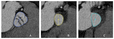 CT血管造影(computed tomographic angiography,CTA):轻度钙化TYPE Ⅰ型二叶瓣(左右融合)(1)瓣环长径31 mm,短径29 mm,周长92.1 mm;升主动脉长径48 mm,短径47 mm;窦管交界平均直径39 mm,左冠状动脉高度14.1 mm,右冠状动脉高度16.1 mm(图2);左、右股动脉最窄处内径分别为7.0 mm及9.2 mm;主动脉根部钙化量62.5 mm3。(2)升主动脉及主动脉弓可见散在钙化,腹主动脉至双侧髂总动脉、髂内动脉可见钙化,管腔未见狭窄,左颈总动脉近段闭塞。(3)中-大量心包积液。