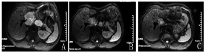 患者入科后完善相关检查。肿瘤标志物基本正常(甲胎蛋白23.2 μg/L,轻度升高)。乙肝小三阳,DNA拷贝数>105 U/ml。肝功能、血常规、凝血功能基本上在正常范围。我院肝脏超声造影提示:肝尾状叶低回声块,肝内胆管细胞癌考虑。2019年11月7日肝脏增强MRI提示:肝脏1段恶性肿瘤,考虑肝癌(肝细胞癌或混合型肝癌可能)伴门静脉主干、肝门区、肝胃间隙及右侧心膈角、腹膜后多发淋巴结转移,肝脏2段弥散加权成像见高信号小结节(图1A)。