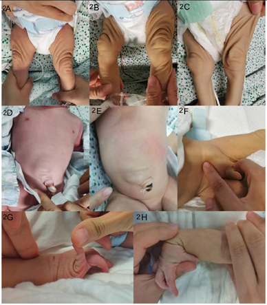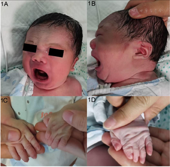 患儿自宫内22周产前超声检查开始发现多系统畸形,包括脑室周围结节型灰质异位、肠管扩张、肾盂积水、手指畸形。产前完善羊水穿刺,染色体核型和微缺失微重复检查没有发现异常。患儿胎龄38周顺产娩出,出生体重3 600 g,生后Apgar评分均10分。患儿生后查体发现特殊面容,表现为眼距宽、鼻梁低、耳位低并伴有外耳道卷曲、左手并指及短指畸形(图1),没有唇裂和腭裂。患儿生后早期呼吸平稳,喂养顺利,但从生后3 d开始逐渐出现进行性加重的呼吸困难、喂养困难和心功能不全表现。呼吸困难表现为呼吸衰竭,需要应用呼吸机辅助通气。喂养困难表现为吸吮力差、纳奶慢、间断呕吐、胃潴留增多。心功能不全表现为心率增快、循环灌注不足、水肿。同时查体发现患儿皮肤逐渐松弛并出现多发疝气,手指关节过度活动等(图2)。
