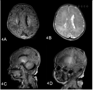 患儿辅助检查提示多系统异常。头颅磁共振成像显示双侧脑室周围结节性异位和大枕大池(图4)。胸部X光显示心影逐渐扩大,同时伴有双肺渗出增多,腹部X光显示肠管扩张,伴发多个气液平面(图5)。超声心动图显示心功能不全、房间隔缺损、动脉导管未闭、二尖瓣发育不良和主动脉扩张。泌尿超声检查发现肾积水。脑干听觉诱发电位显示双耳听通路明显延迟。血液生化检查提示肝酶、心肌酶、B型脑钠肽升高,严重的低钠低氯性碱中毒同时合并低钾血症。新生儿期甲状腺功能检测显示总T4(total T4, TT4)93.40 nmoL/L↓(正常:105.5~208.5 nmoL/L),促甲状腺素(thyroid stimulating hormone,TSH)18.58 uIU/ml↑(正常:0.66~6.29 uIU/ml)。随访过程中发现患儿出现严重的甲状腺功能减退,TT4显著降低(TT4 29.00 nmoL/L),TSH显著升高(>150 uIU/ml)。甲状腺超声显示甲状腺大小正常。