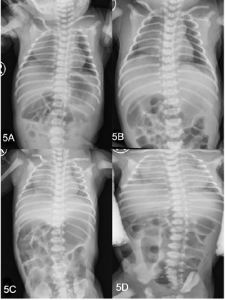 住院治疗期间,我们针对患儿症状给予对症支持治疗。呼吸方面,间断给予清理气道、吸氧、呼吸机辅助通气、糖皮质激素雾化等治疗;喂养方面,给予鼻胃管重力喂养、肠外营养支持;循环方面,适当限制入量,地高辛增强心肌收缩力、联合应用利尿药,并建议家属手术关闭动脉导管;电解质紊乱方面,给予对症补充钠钾、碳酸氢盐等治疗;甲状腺减退方面,给予左旋甲状腺素替代治疗。