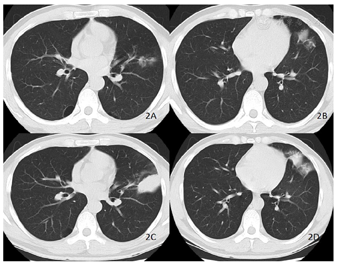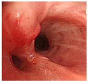 纤维支气管镜检查:气管正常,隆突锐利,左上叶舌段支气管黏膜充血、水肿、肥厚,局部结节状新生物见图1。余双侧主支气管及各叶、段支气管黏膜均无充血、水肿,管腔通畅无狭窄。