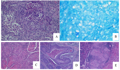 鸟分枝杆菌肺病和肺鳞状细胞癌发病先后探讨:1.鸟分枝杆菌肺病先于肺鳞癌发病。鸟分枝杆菌侵入肺组织内完成定植后形成感染灶,患者可无临床表现,仅在体检时发现。美国癌症协会发现结核病患者患肺癌的危险程度是正常人群的10倍[8]。NTM如鸟分枝感染,在肺癌的发病中是否为危险因素之一,目前并没有报道,是未来探索的方向之一。2.肺鳞癌先于鸟分枝杆菌肺病发病。肺鳞癌多为中心型肺癌,本患者左舌段支气管受累,阻塞所属肺组织,鸟分枝杆菌定植在阻塞的肺组织,形成密闭感染环境,沿着阻塞的支气管发病,形成了肉芽肿炎。3.鸟分枝杆肺病和肺鳞癌同时独立发病。二种疾病互不干扰同时发病,这种情况的概率较低,探讨的病例肺鳞癌和鸟分枝杆菌累及均为左肺上叶,发病部位相同,病灶C角化的鳞癌周边可见肉芽肿病变,若肉芽肿病变为鸟分枝杆菌感染所致,推测可能有某些因素在二者的发病过程中起着关键作用。