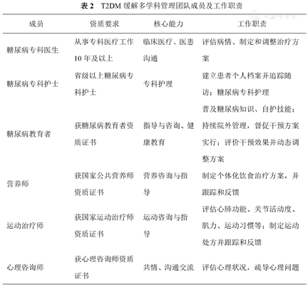 T2DM缓解多学科管理团队成员包括糖尿病专科医生、糖尿病专科护士、糖尿病教育者、营养师、运动治疗师、心理咨询师见表2。