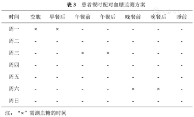患者出院后口服阿卡波糖联合生活方式干预,推荐餐时配对自我血糖监测方案,即每周测3 d分别配对3餐前后的血糖见表3[8]。半个月后血糖达标,遵医嘱停服降糖药单纯生活方式干预,此阶段每周测5:00~7:00血糖谱,每天早晚2次体重监测观察体重维持情况。