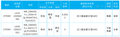 例2:新生儿基因筛查结果提示ETFDH基因异常,家系基因验证显示c.920C>G为父源,疑似致病性变异,c.524G>A为母源,为已知致病突变)。血酰基肉碱谱检测显示辛酰肉碱升高,游离肉碱正常(30.34 µmol/L),可诊断MADD。本例尿有机酸分析未检测出与MADD代谢相关的异常代谢产物。