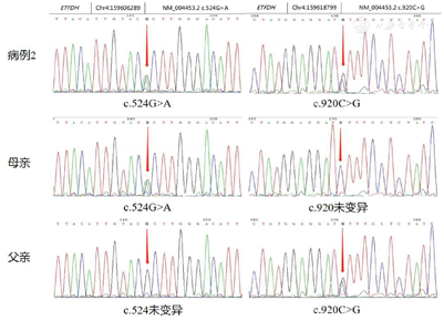 入院后经患儿父母知情同意后,采集患儿及其父母全血各2 ml进行家系增强全外显子测序(深圳安吉康尔医学检验实验室),患儿ETFDH基因检出了复合杂合变异,分别来自父母。母源c.250G>A已被报道为致病变异[2],且为中国南方人常见致病变异[1];父源c.1601C>T在正常人群变异数据库未见报道,HGMD、NCBI报道为致病变异[3],根据ACMG指南,该变异评定为可能致病变异(图1)。