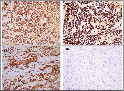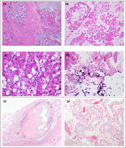 患者入院后行双侧睾丸病变切除术,术后送病理检查。大体所见:右侧睾丸,大小5 cm×4.5 cm×4.5 cm,表面光滑,临床已剖开,包膜完整,切面灰白间黄,几乎均为肿块(图1B),相连附睾4.5 cm×1 cm,切面暗红,充血,相连精索长7 cm,直径1 cm;左侧睾丸,大小3 cm×2.5 cm×2 cm一个,切开见2 cm×1.5 cm囊腔,内容凝血块,相连附睾3.5 cm×1.2 cm,切面暗红,充血,相连精索长7 cm,直径1cm,另见游离灰白肿块样物2.5 cm×1.5 cm×1 cm。经取材制片后显微镜下观察。镜下见双侧睾丸病变基本一致,肿瘤呈多结节状生长(图2A),细胞排列呈巢片状或条索状,细胞主呈上皮样,胞质丰富、嗜酸性,部分胞浆淡染、空泡状(图2B),细胞核大,核仁明显(图2C),间质伴黏液变性及玻璃样变,部分区域可见钙化(图2D);右侧睾丸肿瘤周边组织内可见肿瘤性小结节(图2E),周边睾丸组织中生精小管未见生精现象(图2F)。左侧睾丸肿瘤间质玻璃样变明显,临近肿瘤细胞间质可见黏液变性伴中性粒细胞浸润。基于以上形态,结合患者年龄、肿瘤发生部位及形态学特征,我们考虑了以下肿瘤:1.性索-间质细胞肿瘤;2.肾上腺残余瘤;3.生殖细胞肿瘤;4.上皮源性肿瘤;5.其他;按照初步诊断思路,行免疫组化检测PCK、S-100、CD99、α-Inhibin、Calretinin、MelanA、AR、SALL4、Ki67,结果显示S-100阳性(图3A),a-Inhibin(图3B)及Calretinin阳性(图3C),MelanA、SALL4、CD99、AR及PCK均阴性,Ki67增值指数约1%(图3D),符合睾丸性索-间质细胞肿瘤的免疫表型。