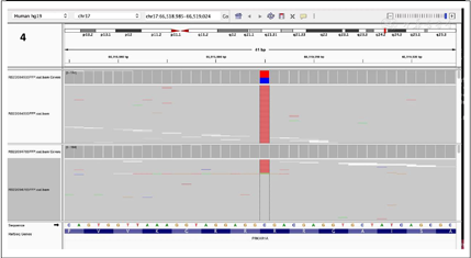 下一代测序(Next Generation Sequencing,NGS)技术检出肿瘤细胞PRKAR1A基因的第96位氨基酸由精氨酸突变成终止子(C.286C>T, p.Arg96*)。同时未检出胚系突变(图4)。
