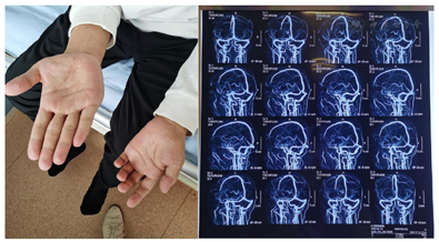 患者,男性,25岁,主诉:"腰背痛及下肢多关节肿痛10余年",首次就诊时间:2010年2月。具体现病史如下:患者于入院前10年,无明显诱因出现双踝关节肿痛,未予以重视,具体诊治不详,其后出现腰背痛、髋关节疼痛明显,夜间翻身困难,活动后稍减轻,无晨僵,无发热、皮疹、口腔溃疡,无眼炎,无腹痛、腹泻,无尿频尿急。于入院前6年,上述症状加重并伴椎体活动度下降,前往西安某医院,化验检查示HLA-B27阳性,ESR 57mm/H,彩超示:左踝关节滑膜炎,左膝关节积液,双侧骶髂关节Ⅱ级以上改变。鉴于患者腰背痛,且符合炎性腰背痛,结合上述化验检查,AS明确,无禁忌给与柳氮磺吡啶1 g bid,来氟米特20 mg qn及NSAIDs等治疗后患者症状有所好转。第二次就诊时间:患者于2020年7月再次就诊,主诉:"头晕、一过性黑矇1月,突发左侧肢体无力1周",入住神经内科,简要病史:患者于此次入院前1月,无明显诱因出现头晕、一过性黑矇,行走可加重,休息稍好转;此次入院前1周,无明显诱因出现左侧肢体无力,左上肢不能握物(图1A),左下肢肌力减弱,长时间行走后左侧下肢出现跛行,无麻木,无疼痛,无肢体抽搐。以"脑血管病?"收住我院神经内科。