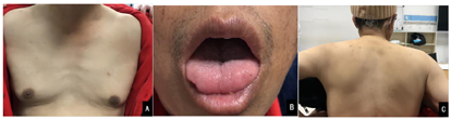 入院体格检查:体温36.5℃,脉搏66次/min,呼吸18次/min,血压147/97 mmHg(1 mmHg=0.133 kPa)。双肺呼吸音清,双肺闻及干湿啰音,心率66次/min,心律齐,心脏瓣膜听诊区未闻及病理性杂音,乳房女性化(图1A),腹平软,全腹无压痛,肝脾未触及,双下肢无水肿。专科体格检查:神志清楚,言语流利,对答切题,定向、计算、记忆力正常,双侧瞳孔等大等圆,对光反射灵敏,眼球各向活动可,无复视眼震,双侧额纹、鼻唇沟对称,面肌和下颌肌可见肌肉束颤,伸舌受限,舌肌可见萎缩及肌束震颤(图1B),双侧软腭上抬正常,悬雍垂居中,双侧咽反射消失,耸肩、转颈正常,四肢及躯干肌肉萎缩,以肩胛带肌群(图1C)和骨盆带肌群为主,可见肌束震颤,双上肢近端肌力3级,远端肌力4级,双下肢近端肌力2级,远端肌力2级,四肢肌张力减低,腱反射消失,指鼻试验、轮替试验、跟膝胫试验无法配合,全身针刺痛及深感觉对称存在,病理征及脑膜刺激征(−),洼田饮水试验3级。