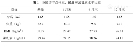 各随访节点体重、BMI和泌乳素水平比较