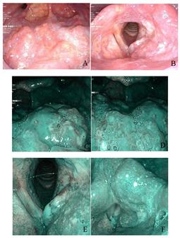 患者,男性,47岁,服装加工厂工人,患者4个月前受凉后出现发热、咳嗽、持续性声音嘶哑,无其他特殊不适,诊所自购配药治疗1个月后发热、咳嗽缓解,声嘶无明显缓解,遂至我院门诊。门诊第1次查NBI喉镜(2021年10月18日)后给予患者消炎消肿散结治疗2周后症状无缓解,并出现咽喉疼痛感;患者再次至我科复诊,第2次查NBI喉镜(2021年11月11日)、胸部CT等检查后高度怀疑继发性肺结核,建议患者结核专科医院就诊进一步治疗。患者未至专科医院就诊,继续当地医院消炎止痛对症治疗,1个月前患者咽喉疼痛加重,再次至我科就诊,第3次查NBI喉镜(2021年12月8日)、喉镜下咽喉肿物组织活检,确诊喉结核。