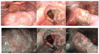 2021年11月11日复查NBI喉镜,白光下所见如图2A、B,及NBI下所见如图2C~F。胸部CT:双肺多发病灶,考虑继发性肺结核。3日痰找抗酸杆菌阴性,红细胞沉降率升高62 mm/h,结核杆菌抗原抗体均阴性,癌胚抗原阴性。RFS评分:9分,RSI评分:19分,进一步胃镜及14C呼气试验:非活动性胃炎伴C2型萎缩,胃窦糜烂;14C呼气试验阳性。