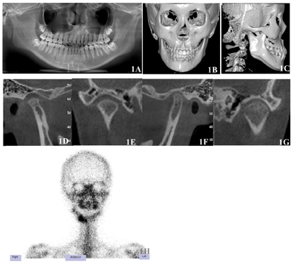 (1)关节术前X线检查:曲面断层X线片显示左侧下颌较右侧在三维方向上增大,左侧髁突颈较右侧更为细长,左侧下颌升支较右侧长约4 mm。头颅三维重建可见颏前点相对于面中线右偏3.5 mm;双侧下颌体界限不对称。锥体束计算机断层扫描(CBCT)显示双侧颞下颌关节闭口位时,右侧关节前、后、上间隙等大,右侧髁突骨质吸收,形态短小,骨质轻度硬化;左侧关节前间隙增大,髁突头体积增大。SPECT检查结果显示左侧髁突放射性密度增高,左侧髁突同位素摄取百分率约为60.1%。综上,满足"活跃型左侧CH(垂直型)"的诊断特征[4,5](图1)。