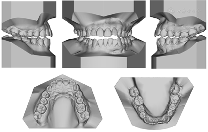 (6)正畸术前模型分析:上颌牙列拥挤度3 mm,下颌牙列拥挤度5 mm;Bolton比:前牙比79.6%,全牙比92.2%;Spee曲线曲度1.5 mm;上牙弓后段宽度46.8 mm,下牙弓后段宽度41.0 mm(图4)。