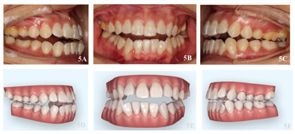 UCH术后面部偏斜患者隐形矫治的重要前提是正确建立初始咬合。须以颏部正中与面中线对齐为标准建立初始咬合,旨在在这种状态下模拟患者终末颏部对齐面中线的状态,准确发现该状态下现存咬合干扰的位点,然后通过隐形矫治器去除牙齿代偿及干扰,并最终达到改善患者面部偏斜的目的。本病例患者以颏部正中与面中线对齐为标准建立初始咬合后发现,前牙及右侧后牙I度开合,左侧后牙反合,右侧后牙正锁合。