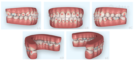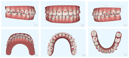 矫治方案设计33-43各牙近远中邻面片切0.25 mm,关闭前牙散在间隙,达到前牙正常覆合覆盖,双侧后牙重咬合(图8)。