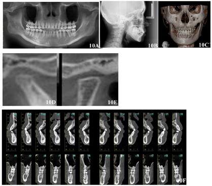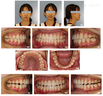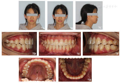 患者,女性,16岁,主诉前牙不能咬合1+个月,现要求矫治。患者自述1+个月前因右侧关节弹响就诊于我院颞下颌关节外科,X线检查及单光子发射计算机断层扫描检查提示"左侧髁突骨质代谢异常活跃",诊断为"活跃型左侧髁突肥大(垂直型)"。后全麻下行"左侧髁突肥大高位切除术+阻生牙拔除术"。现关节症状稳定,自觉前牙不能咬合,要求正畸矫治。