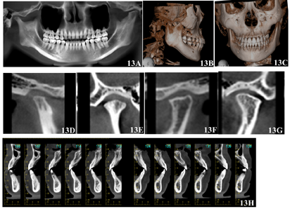 UCH分为垂直型、水平型以及混合型,是一种髁突进展性、过度生长性的疾病,11~30岁年龄组人群好发[6]。病程长者可导致关节源性的下颌偏斜,健侧关节出现弹响、疼痛及张口受限等不适,同时患者具有典型的口外及口内特征:下颌向健侧偏斜,双侧口角高低不一,面下1/3高度增加,面型狭长;合平面偏斜,患侧上后牙及健侧下后牙代偿性舌向倾斜,使得健侧后牙对刃甚至反合。UCH的病因及发病机制目前尚不明确,可能与偏侧咀嚼、反锁合、外伤、肿瘤、内分泌紊乱及关节先天畸形等因素有关[7]。对于UCH的诊断,除了临床专科检查外,SPECT因其具有较高的解剖学精度和灵敏度,成为目前诊断UCH最为成熟的影像学诊断方法。当SPECT的检查结果显示患侧髁突的同位素摄取百分率≥55%时,考虑该侧髁突骨质代谢异常活跃[3]。对于活跃型UCH,目前临床上发现采用"髁突高位切除术+术后正畸"能使垂直型及混合型患者获得高质量的美观及功能疗效,然而对于水平型患者,这种治疗方式并不能明显改善面容美观以及咬合关系[8]。"髁突高位切除术+术后正畸"这一联合治疗先通过手术切除过度生长的髁突,术后再进行正畸治疗去除代偿,使髁突回到关节窝,并获得功能咬合,从而促进关节结构的稳定。本病例患者通过临床检查、X线片检查以及SPECT检查后发现,患者具有垂直型UCH的典型特征并且左侧髁突处于过度活跃状态,因此对其诊断为"活跃型左侧CH(垂直型)"。后对患者采取了"左侧CH高位切除术"。术后患者关节症状改善,但面部仍然偏斜,并且前牙及右侧后牙开合,遂至正畸科就诊。
