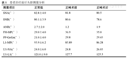 (5)正畸术前X线检查:自然头位下,曲面断层X线片未见明显牙槽骨吸收,未见18、28、38、48。头颅三维重建可见颏部明显右偏。CBCT显示左侧髁突术后断面平整,关节间隙增大;右侧髁突形态不佳,骨皮质连续,关节前、上、后间隙约为1:1:2;各牙根-骨关系未见明显异常。头颅侧位X线片测量数据:SNA角81.8°,SNB角80.6°,ANB角1.2°,FH-MP角36.9°,PP-GoGn角29.8°(图3,表1)。