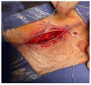 与患者明确交代手术风险,尤其是炎性窦道可能存在的切口污染问题,可能导致颅内感染,钛板置入失败等,家属态度坚决,要求手术。首先在术前30 min给予头孢曲松静脉滴注,并在术前对患者皮肤及局部窦道进行严格消毒(4%碘酊+75%酒精),尤其是对窦道深部进行反复擦拭灌洗。对每层组织进行分层次消毒冲洗(过氧化氢+0.05%碘伏),手术先从颞顶部游离皮瓣,其次从两侧向右额窦道周围游离皮肤,最终将粘连皮肤从前颅底分离,并再次进行创面彻底消毒,对窦道周围可疑感染组织进行清创,对切缘皮肤及分泌物送细菌学检测,确定感染灶清除彻底。确定塑性钛板与缺损部位贴合良好,皮肤张力适中。最后取右侧颞肌反折,固定于原皮肤窦道处皮下并固定以改善局部血运,预防皮肤缺血坏死,分层缝合颞肌,皮下及皮肤,最终手术顺利结束。