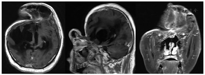 意识朦胧状态,呼唤可睁眼,双侧瞳孔等大2.5∶2.5,对光反射存在,无法正确对答,四肢可自主活动,肌力稍弱。双额、右颞顶颅骨缺损,右额皮肤遗留炎性窦道。