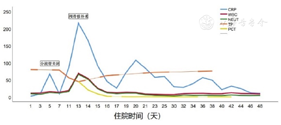 在颅脑损伤相关炎性反应最快可在脑部损伤发生后的几分钟内产生一系列应答,主要过程包括神经胶质激活、白细胞募集和分泌炎性介质,如细胞因子和细胞趋化因子等。其中细胞因子聚集介导的炎症反应是重要的组成部分,分泌主要来自不同的免疫活性细胞,如小胶质细胞、星形胶质细胞、脑血管内皮细胞、外周免疫细胞,甚至神经元[1,2]。其包括白细胞介素-1β,肿瘤坏死因子(TNF),IL-6和,IL-8等[3]。除此之外,细胞因子在免疫调节,维持机体稳态,以及炎症修复中同样起到重要作用[4,5,6]。其中IL-6作为免疫应答的核心部分,对C反应蛋白,IL-8,以及促进体液免疫应答具有重要正向作用,测定急性期IL-6可能对于预测疾病发展及预后有重要价值[7,8,9]。细胞因子的急性期变化反映了机体对于炎症及创伤刺激的免疫能力,动态监测更可以预测疾病发展走势[10,11,12]。IL-1β聚集可导致血脑屏障破坏,中性粒细胞聚集等,甚至可预测颅脑损伤后激发癫痫事件发生[13,14]。本例患者术前颅内感染风险较高,手术复杂,术中进行深静脉穿刺并留置深静脉,术后出现深静脉相关感染,感染源较复杂。我们在炎症爆发初期便进行了经验性抗感染药物应用,并及时进行了一系列痰液,静脉血,脑脊液细菌学检测,及时发现了感染源规律的敏感以期对此类患者的临床管理提供治疗参考。对其各项炎性指标进行检测,并观察其随病情走势出现的变化。