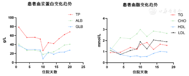 由于患者术前存在多方面感染高危因素:包括皮肤窦道可能存在细菌繁殖,术中深静脉穿刺可能造成感染,患者术前营养不良等。本例患者术后第2天即出现高热症状,合并意识状态下降,体温39.2°C,PCT 45 ng/ml,CRP 215.47 mg/L,WBC 68.72×109/L,考虑深静脉穿刺相关感染继发感染性休克,肝肾功能异常,病情危重,机体消耗增加,同时胃肠功能受损,因此在术后炎症暴发初期,我们依然恢复采用了包括糖类,氨基酸,鱼油脂肪乳,维生素等必需营养物质在内的肠外营养以度过急性期,在患者度过围手术期后,逐步由肠外营养向肠内营养过渡,在肠内营养中混入肠道益生菌,如地衣芽孢杆菌,枯草杆菌,双歧杆菌等,保护患者肠道屏障,并在康复医院完成由肠内营养到自主进食。本例患者在出现深静脉相关感染后,蛋白水平急剧下降,见图6。