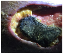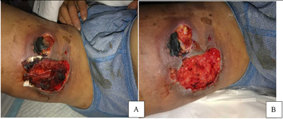 外科检查:右侧大腿内侧溃疡创面,大小约10 cm×10 cm,有脓性分泌物,伴臭味,创面深达皮下脂肪层及肌层,周围皮肤红肿,压痛明显。见图1。