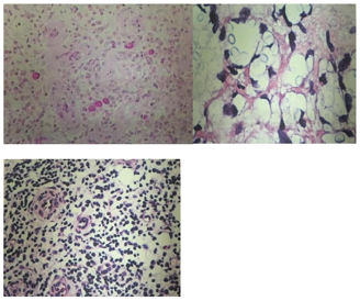 入院辅查:CD4淋巴细胞计数96 cell/ul,病毒载量445 000 cp/ml,CRP 6 mg/L,PCT 0.13 mg/ml,G实验<10 pg/ml,红细胞沉降率45 mm/h,CMV-DNA阴性,弓形虫抗体阴性,TPPA阴性,HCV抗体阴性,γ干扰素释放试验阴性,HBV-DNA 4 210 000 U/ml,心电图回示正常,腹部B超提示肝回声改变,头腹CT未见明显异常,胸部CT提示双肺少许斑点状密度增高影,考虑双肺感染。皮肤病变经特殊染色结果支持真菌感染(新隐球菌),特殊染色结果:PAS弱+、银染弱+。送检炎性肉芽组织、脂肪组织内见较多隐球菌。见图2。